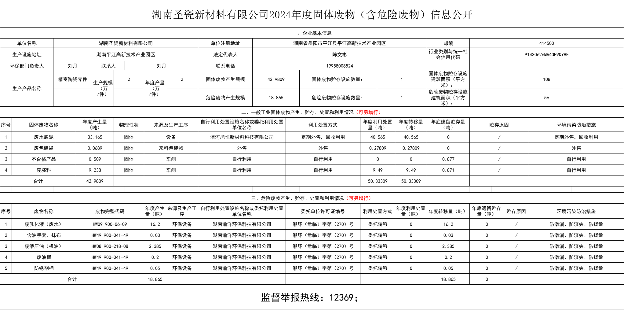 湖南圣瓷新材料有限公司2024年度固體廢物(含危險廢物)信息公開